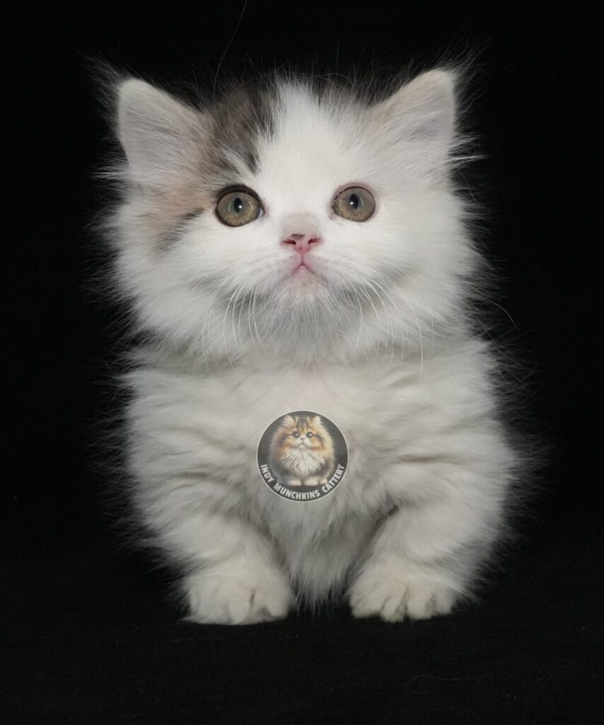 SHORT legs. BLUE eyes. Female. Long hair. Low amount of shedding. Standard minuet. Black (brown) mackerel tabby / bicolor. Parents: Keekee & Atlas. Born on 11/30/2025.