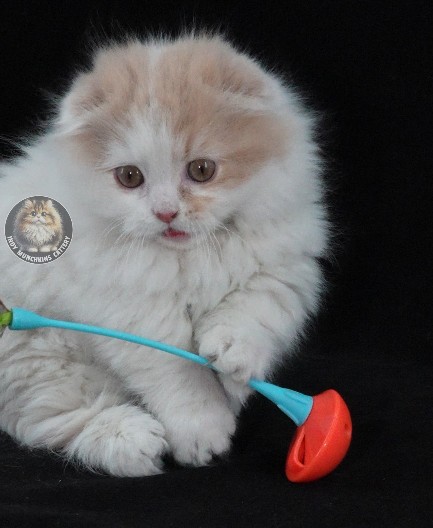 SHORT legs. FOLDED ears. Long hair. Male. Cream mackerel tabby/bicolor coat. Standard Scottish Kilt. Low amount of shedding. Neuter included. Parents: Eva and Atlas. Born on 11/16/25.